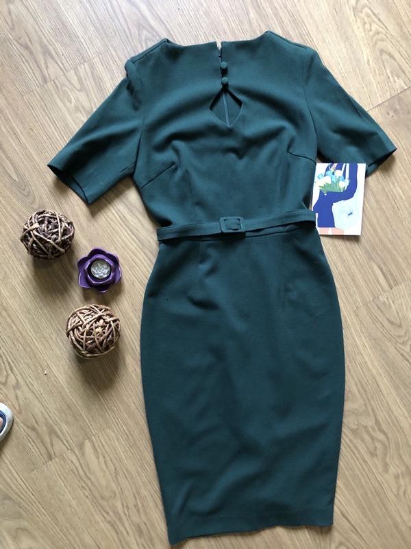 Вишукана сукня, по фігурі, з ремінцем, цупкий трикотаж, приглушено зелений колір, з вирізом на декольте, та змійкою на спині, чудовий фасон