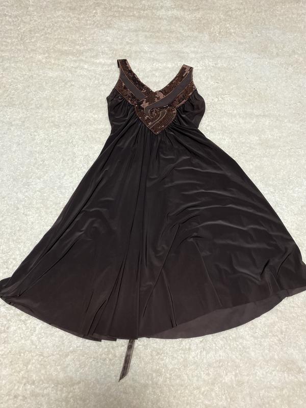 Вечірня сукня, також може бути коктельною Дуже приємний стрейчевий матеріал, не просвічується (!), тканина плотна, бюст зі стразами (не відриваються!), бюст корсетом, зав‘язки на спині. Дуже красивий шоколадний колір. Довжина - трошки закриває коліна (при рості 167 см). Розмір - ХS/S В ідеальному стані (вдягнута була на випускний).