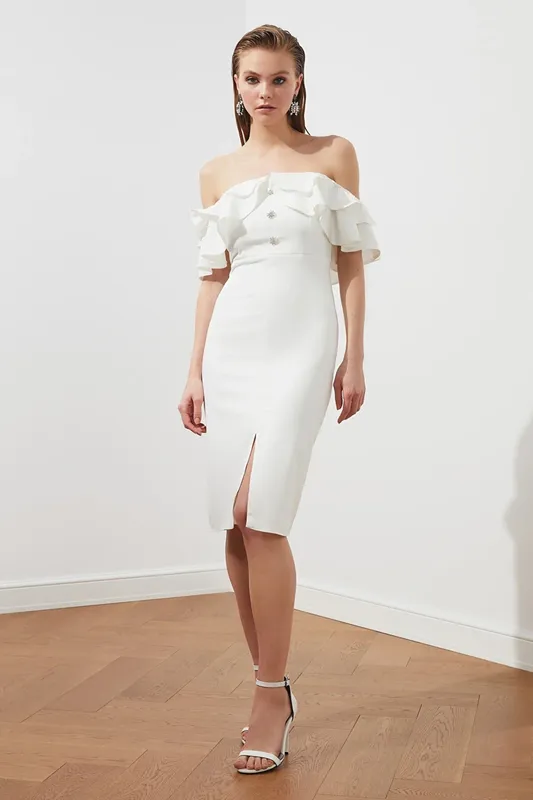 Сукня міді з опущеними плечима і розрізом спереді. Колір : білий. Розмір: M, L