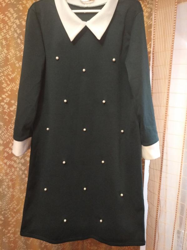 сукня зеленого кольору з перлинами( не приклеєні а проколоті) комірець білий, рукав 3/4 довжина рукава 44 ог 40 довжина від пахв 60