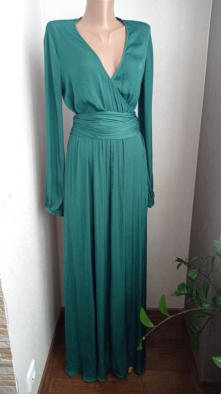 Сукня дуже приємна до тіла, глибокий виріз має защіпку(останнє фото), також має довгий пасок яким можна підкреслити талію або приховати недоліки) сукня довга, на ріст 175 см, чудова довжина. має розрізи до коліна по двох сторонах. плечі- 38 см рукав- 61 см талія - 35 см(резинка) довжина - 150см