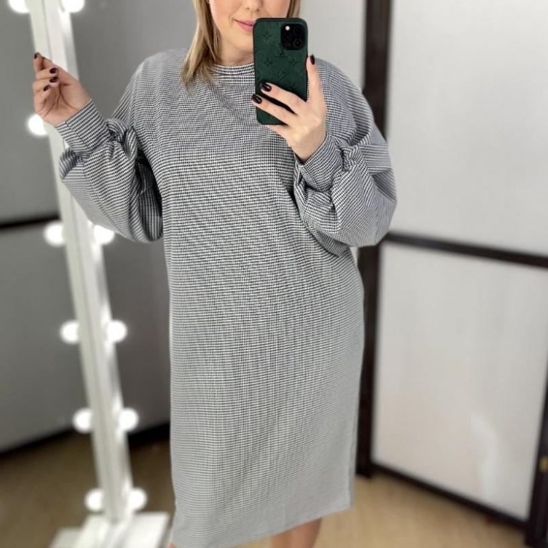 за біркою 4 хл тканина тягнеться по фігурі довжина 108см рукав від горловини 70 см, ПОГ 65-66см ПОБедра 70-71см виміри без натягу .Горловина висотою 4см вільно .Рукав широкий біля манжета,висота якого6см. Дууже комфортне і приємне до тіла-на всі випадки .Тканина приховує за рахунок принта-дрібна "гусяча лапка" темно-сіра на світло-сірому фоні-дууже актуально і завжди в моді Склад-60%віскоза 30%пе 10%еластан-трикотаж ,не вязка,не мнеться Оверсайз.Демісезон