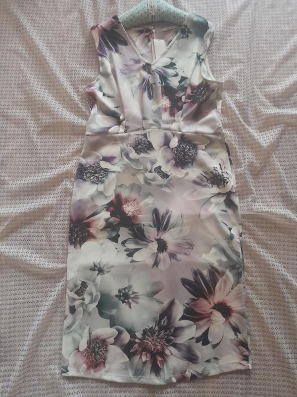 Розкішна міді сукня в квіти TU Нова, з етикеткою. Сток, може мати запах обробки, піде після прання. Просто шикарні квіти, їх можна розглядати вічно))) Красивий жіночний крой, елегантна довжина. Щільна еластична тканина типу неопрена Ззаду довга блискавка. Розмір 16 Довжина по спинці 107см, від верху до талії 37см ,плечі 40см, під руками 47см, ПОТ 43см, ПОБ 51,5см