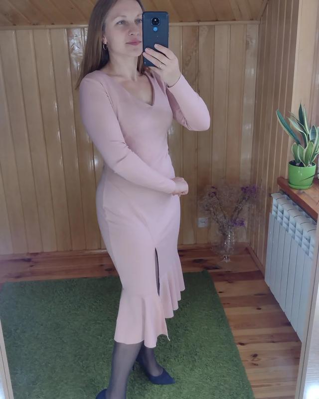 Новое трикотажное платье пудрового цвета с эффектным разрезом на ножке и рюшей по низу Очень женственная модель кроя🤍 Размер S/M Смотрите замеры 📍ПОГ 48 📍ПОТ 37 📍ПОБ 47 📍длина изделия 108 📍длина рукава 58 📍плечи 39 Ткань тянется, здесь шерсть в составе отсутствует, только в зеленом платье При покупке от двух вещей обязательно скидка 💰