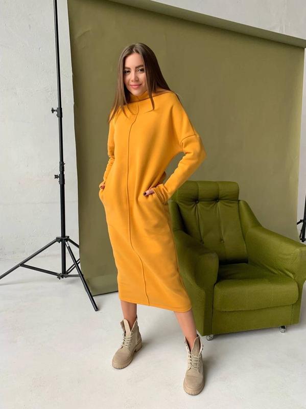 Сукня 2029с Розміри 42-44, 46-48,50-52 Тканина: тринитка на флісі ❄ Кольори: сірий, гірчиця, пісочний Ворота подвійні, кишені робітники❗ Дуже тепла сукня, чудова альтернатива костюмам.