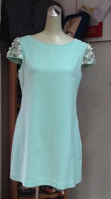 Платье укороченное , нежного ментолового цвета , коротенький рукавчик расшит объемными цветами . Без воротника . Модель классического силуэта , короткое прямое . Шикарное современное модное молодежное платье , подходит как для торжества , для праздничного случая , коктейля . Размер: L. Производство Италия .