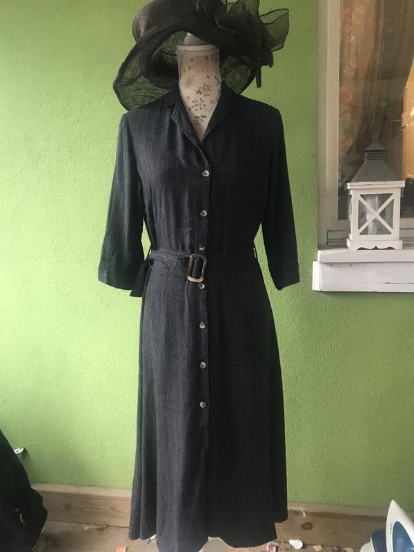 Стильное платье длиной миди от Mango. Красивая модель, юбка-клешь, пуговицы расстёгиваются по всей длине. Красивая пряжка на поясе эффектно пересекается с пуговицами, рукав-3/4. Цвет-темно-серыйв тонкую полоску. Размер по бирке-М. Замеры по запросу. Бирка с составом срезана, но платье не летнее.