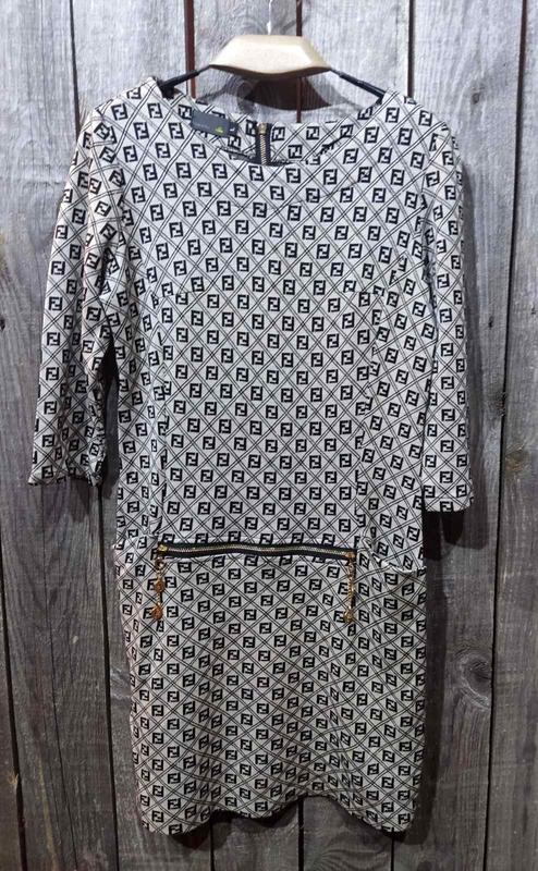 Крутле платье в монограммы. Плотная ткань. Трикотаж. Тянется. Золотая фурнитура. Рукав 3/4.по спинке молния. Размер указан Л, скорее сядет на М. Состояние отличное