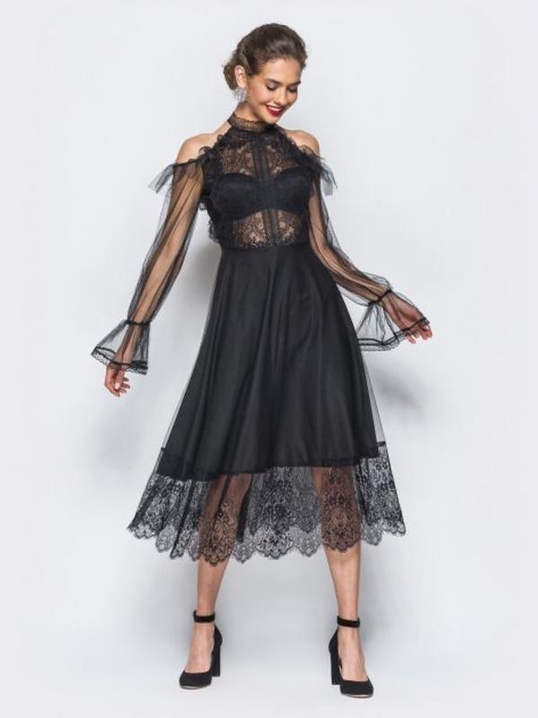 Чудова мереживна сукня з відкритими плечима і фатиновими рукавами.Придбана в онлайн магазині “Lady Look”,проліт з розміром.Довжина-125см,півобхват бюсту-45см(+3см розтягується),півобхват талії-33см,рукав-57см.Ззаді прихована блискавка та дві заклепки.