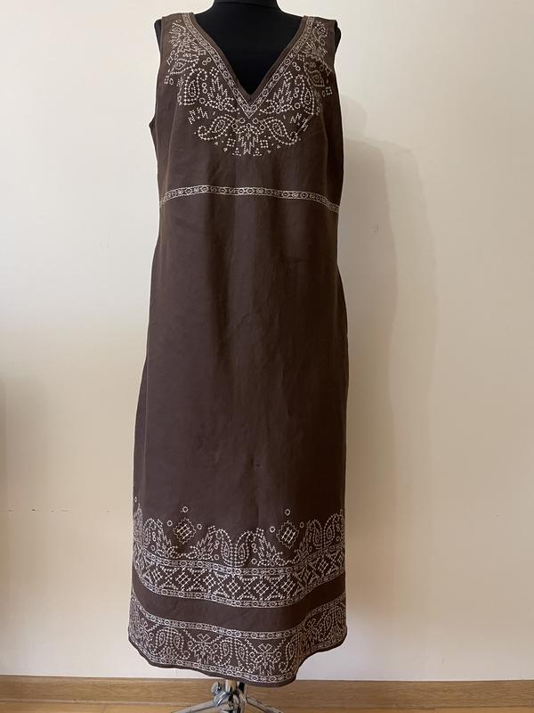 Лляна сукня - міді коричневого кольору з вишивкою 14/16 розміру льон