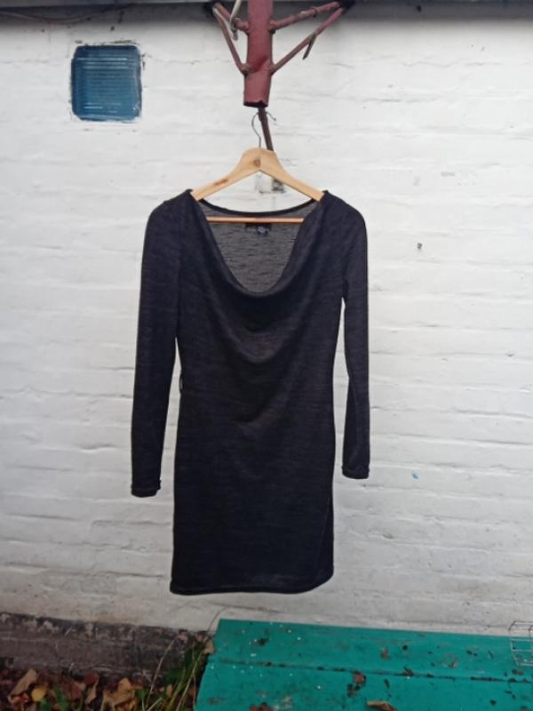 длина 88,пог 48,талія 38,низ 43,рукав 61,плечі 36,красивий воротник звисаючий, трикотаж, колір темно сірий з оливковим,стан нового.
