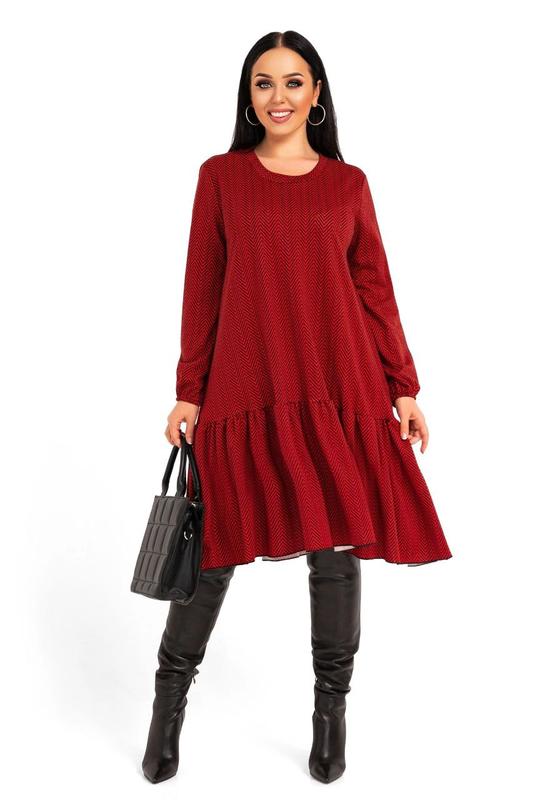 Сукня D Модель № 7184-1 Ціна 450 грн Розмір : 46-48; 50-52; 54-56; 58-60 Тканина : трикотаж ангора софт ГАРНА РОЗТЯЖНІСТЬ Довжина сукні : 105 см . Довжина рукава : 63 см. Стильна , практична , сучасна сукня , з приємної тканини - ангора софт , має розтяжність . Сукня просторого покрою -трапеція , в низу з воланом , рукав з манжетом .