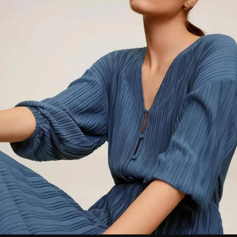Состояние хорошее грязно-синий длина 125 см, пог 48см, пот ( резинка) 35см+, поб( есть подъюбник) 58см, рукав 35см( низ на резинке) одето на манекен 46-48 р
