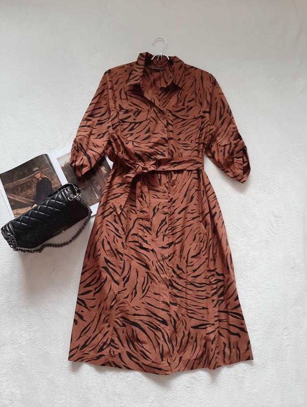 Трендове плаття коричневого кольору,з принтом зебри.Довжина міді ,рукав 3/4,застібається на гудзики.Дуже гарно дивиться на тілі.Розмір L.ПОП-40,ПОГ-55,талія корегується паском(загальний полооборот 50см)Пошите трапецією,довжина 120см.Стан ідеальний.