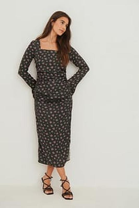 Цікава сукня з квітковим принтом NA-KD По ліву сторону є невисокий розріз нижче коліна По всій довжині призібране по краям На рукавах є невисокі розрізи Не просвічується Євро 40