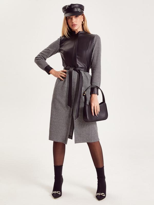 Плаття-сорочка з комбінації чорної шкіри та жакарду в клітинку. Модель відрізна вздовж талії з коміром-стійкою та кишенями з боків. Позаду шліца. Застібається на приховану блискавку по планці. Пояс у комплекті. 📍Артикул: 42771 👗Розміри: 46, 48, 50 🪡Матеріал: жакард