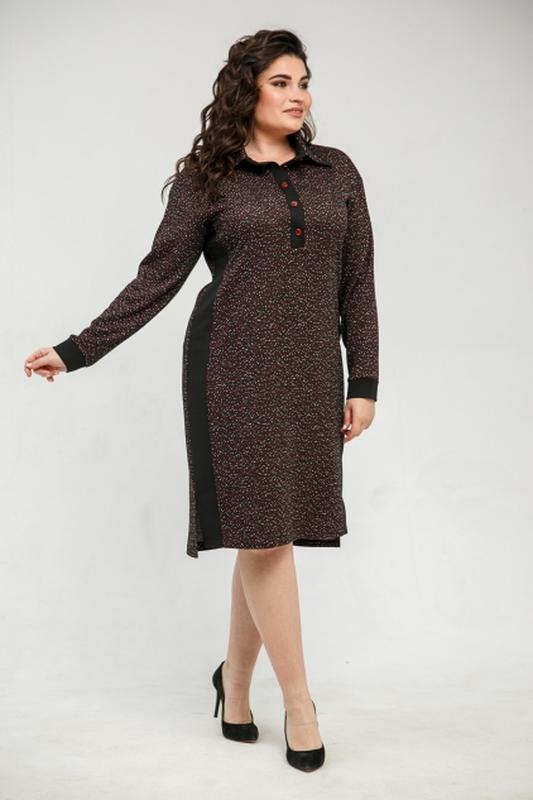 Лаконічне плаття із щільного трикотажу. Рукав довгий на манжеті. Поділ асиметричний, з невеликими розрізами з боків. Воріт відкладний, декорований функціональними гудзиками. Представлена сукня підійде для повсякденного носіння та офісних буднів. Розмір: 50,52,54,56,58,60