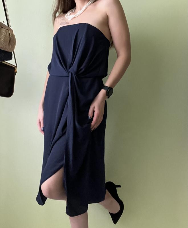 Бірочку відсутня з складом тканини . Є підкладка . Зверху шифон. Спереду на грудях силіконова смужка . Елегантна, проста, зручна. Талія ззаду на резинці. Довжина спереду 84,ззаду 89см. Пот30см є гумка, тому спокійно до 70см Ог спокійно до 90-92см