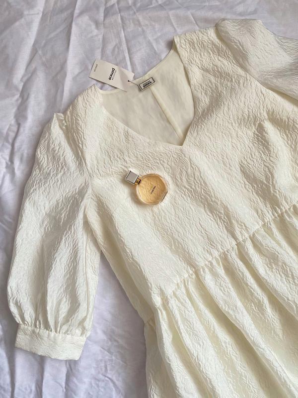 Асиметрична фактурна сукня з об'ємними рукавами 🤍 Чудово тримає форму, як хмаринка ☁️ Приємного молочного кольору, вільного крою😌 Новенька, з біркою 📌 Рoзмір: m