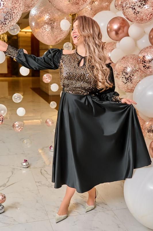 Сукня миди Арт volo 5701 💥Ціна 720 грн Матеріал: атлас-сатин на щільній основі. Довжина виробу 122 см. Перед - Паєтка на оксамит. Спідниця - напівсонце, гарно лягати по фігурі і не товстить. Талія вільна, ззаду зав'язується поясом. Цим регулюється ступінь приталеності. Плечі рукава на гумці-можна спускати і обніжувати їх. Виміри: 🎈48-52: ОГ 96-105, ОТ до 105, ОБ до 122 🎈54-58: ОГ 106-116, ОТ до 116, ОБ до 138 🎈60-64: ОГ 118-128, ОТ до 128, ОБ до 148 Розміри: 48-52, 54-58, 60-64