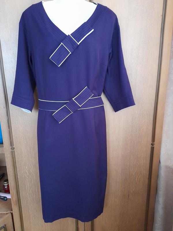 Красиве плаття на свято і на будень. Плаття прямого силуету, трішки завужене донизу, відрізне по талії, на підкладці, красивого фіолетового кольору (на фото колір трохи змінений , фото 7 найбільше відповідає дійсності), з блискавкою потаємною по середині спини (50 см ) , здаду шліца. Довжина по від середини спинки - 102 см , ПОГ - 56 см, ПОТ - 51 см ПОБ - 58см, ПОнизу спідниці - 56 см, довжина від середини спинки до талії - 38 см ,відстань між плечима 50 см, довжина рукава - 37 см, ПОРукава внизу- 15 см. склад тканини: віскоза - 70%, котон - 25%, еластан -5%. є один недолік: в зоні підмишок трішки світліший колір, при вдяганні плаття не видно ( фото9).