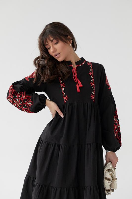 Это стильное платье-вышиванка с вышивкой гладью не просто сделает твой модный образ очаровательным, оно еще и подчеркнет красоту фигуры. В модели рукава вверху идут с кокеткой, а внизу собраны на резинку. Круглая горловина дополнена небольшим разрезом с завязками. Талия отрезная, без резинки. Низ платья плавно расклешен за счет оборок. За счет подкладки платье не просвечивает. 🌱цвет: черный/красный 🌱размер: S M L Замеры уточняйте 🌱состав: 80% хлопок | 20% полиэстер