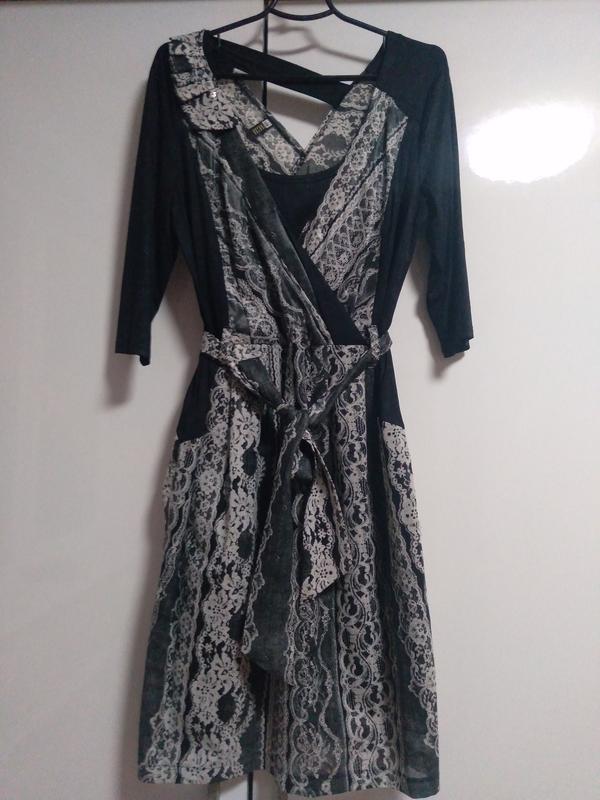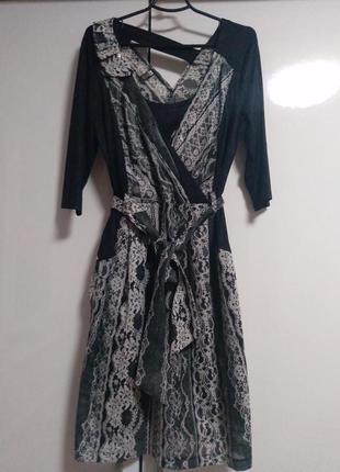 Повседневное,удобное платье. Низ на подкладе. Рукав 3/4. Горловина декольте. СПинка в-образный вырез перехваченный планкой. Чёрная ткань-жатый трикотаж,серая в цветок-хлопок с напылением. Юбка заужена к низу .