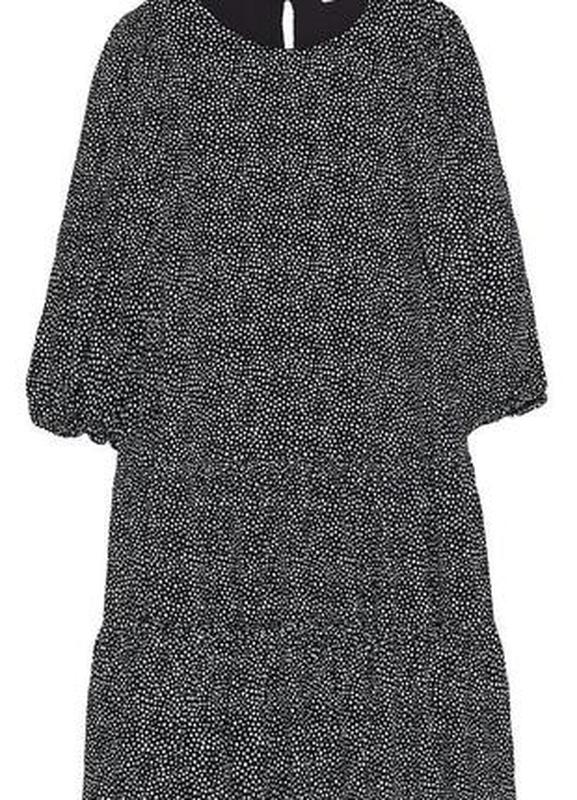 Платье ZARA с круглым вырезом, рукавами бафами ниже локтя с эластичной окантовкой, рюшами по низу. Светло-кремовый точечный узор на черном. , Размер S. Без бумажных бирок.