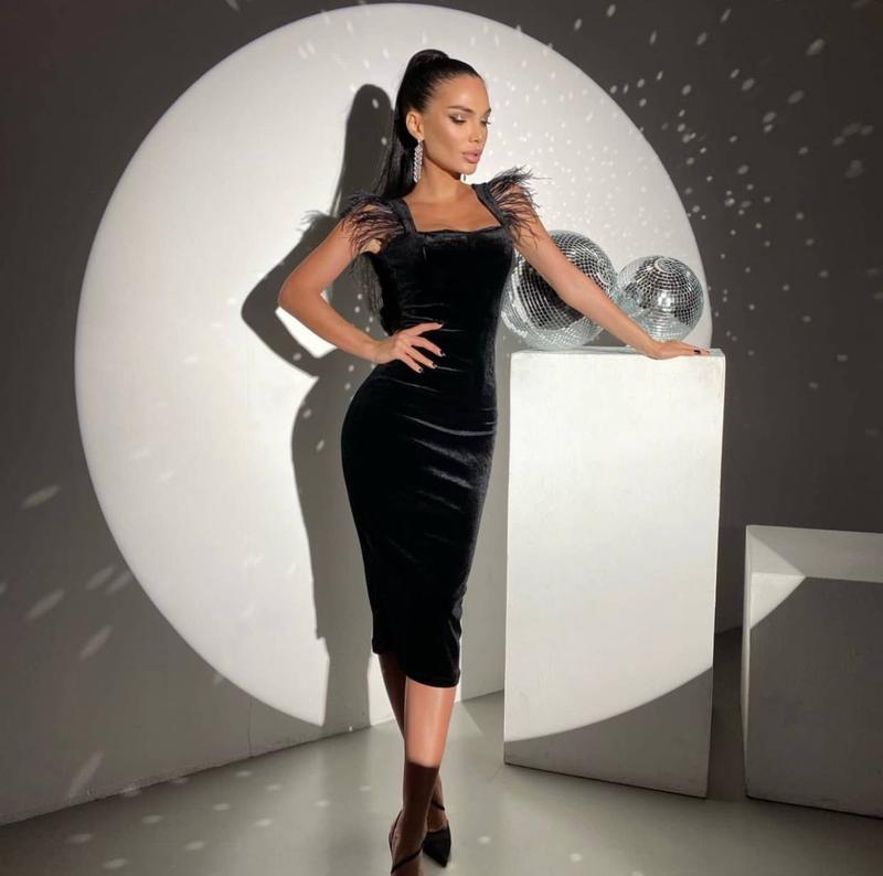 Чёрное аксамитовое облегающее платье миди на дрительках с глубоким декольте