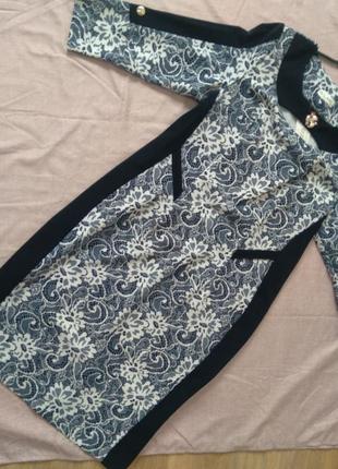 Темно-^синє Повсякденно-порядне плаття приталеного крою. Горловина кругла з крапелькою.рукава3/4. Кишені обманки.з боків сині лампаси.