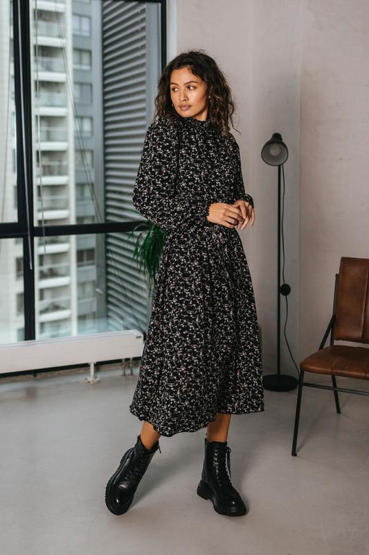 Сукня Модель: 2038.5275 Матеріал: софт Колір: чорний Категорія: елегантні, міські/вуличні, повсякденні, святкові Сезон: весна, демісезон, осінь Фасон: вільний, розкльошений, з пишною спідницею Принт: квітковий принт Декоративні елементи: комір і манжет на резинці, збірка по окату рукава і по горловині, рюша по краю коміра та манжета Фурнітура: гудзики Вид застібки: гудзики Горловина: комірець стійка Вид рукава: довгий, втачний рукав, пишний рукав, амадис Конструктивні елементи: розрізна талія на резинці, складання по горловині, підкладка Комплектація: сукня Догляд: ручне прання до 30° _______________________________ ДЛИНА ИЗДЕЛИЯ ОТ ВЕРХНЕЙ ТОЧКИ ПЛЕЧА S-M=121 см, L-XL=122,5 см ДЛИНА РУКАВА S-M=68,5 см, L-XL=69,5 см
