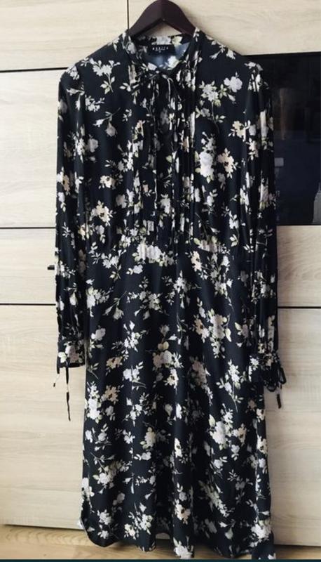 Красивое платье Mohito, 38 р. в цветочный принт. Длина 116 см, сбоку есть застежка на молнию. манжеты рукавов застегиваются на две пуговицы. Есть подкладка. Черного цвета.
