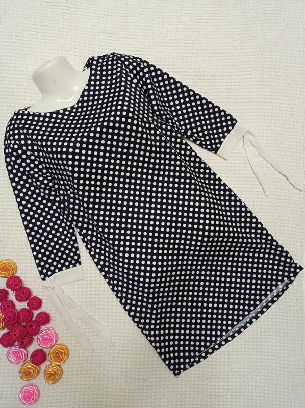 Платье черное прямого кроя в белый горох с завязками на рукавах, на спине замочек, ткань трикотажная, не мнется, тянется, в новом состоянии, но есть нюанс, вшитый замочек по воротнику не ровно (фото) в носке его не заметно Замеры на фото