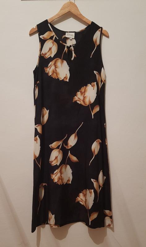 Сукня (плаття) міді, без рукавів. Сукня літня, легка, без замка, без шліци, без підкладки. Розмір 16. 100% віскоза. Стан хороший. Заміри: ПОП 36см ПОГ 49см ПОТ 47см ПОБ 57см Довжина 112см
