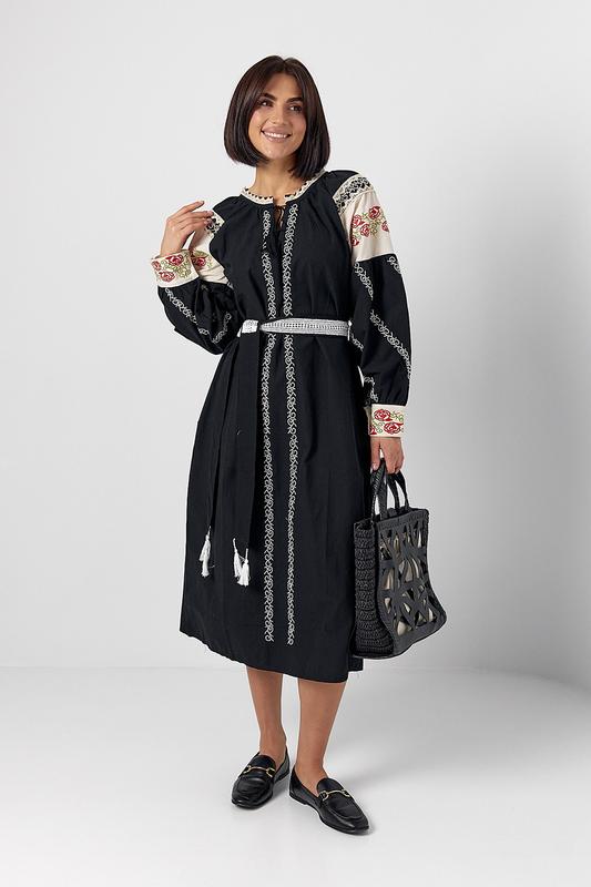 ЗАМІРИ ВИРОБУ Ширина під проймами рукавів (над грудьми), см S - 54см; M - 53см; L - 55см; XL - 56см Довжина рукава від горловини, см S - 69см; M - 69см; L - 69см; XL - 69см Довжина рукава по внутрішньому шву, см S - 49см; M - 49см; L - 49см; XL - 49см Ширина по стегнам S - 58см; M - 57см; L - 59см; XL - 60см Ширина по талії/поясу, см S - 56см; M - 55см; L - 57см; XL - 58см Довжина виробу, см S - 121см; M - 121см; L - 121см; XL - 121см РОЗМІРНА СІТКА ХАРАКТЕРИСТИКА ТОВАРУ Країна Туреччина Тканина Бавовна Склад тканини 100% бавовна Параметри моделі 84*60*92 зріст 173 Розмір на фото S ОПИС АРТ. 6856 Жіноча сукня міді з вишитими трояндами — елемент гардероба, що поєднує елегантність і вишукану етнічну нотку. Модель має вільний крій, що забезпечує комфорт і невимушений силует. Довгі рукави-ліхтарики створюють легкість і романтичність образу, а манжети на ґудзиках додають акуратності. До сукні у комплекті йде мереживний пояс з китицями. Особливий акцент — вишиті троянди на рукавах, які надають вбранню жіночності та витонченості. Оригінальна деталь — розріз на грудях із зав'язками-китицями, що додає нотку богемного стилю та дозволяє регулювати глибину вирізу. Такий виріб — ідеальний вибір для створення ніжного, стильного образу як на кожен день, так і для особливих подій.