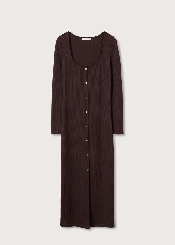 Коричневое трикотажное платье миди в рубчик mango приталенное платье на пуговицах манго