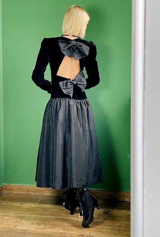 Вінтажна сукня міді з чорного оксамиту з відкритою спиною та акцентними бантами