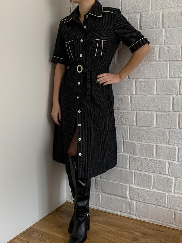 Шерстяное платье миди в мелкую полоску с поясом, на подкладке. Размер 36 S, состояние просто идеальное Параметры: длина по спине: 104 см, плечи: 38 см, ПОГ: 45 см, ПОТ: 36 см
