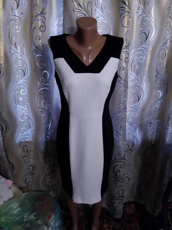 Стильна жіноча сукня Next. Розмір – UK 12 EUR 40. Заміри: - напівобхват грудей 45-49 см, - напівобхват талії 39-45 см, - напівобхват стегон 48-55 см, - довжина 100 см. На підкладці. Застібається блискавкою на спинці. Склад: чорна частина – 62% поліестер, 33% віскоза, 2% еластан; біла вставка – 77% поліестер, 19% віскоза, 4% еластан; підкладка – 100% поліестер. В ідеальному стані
