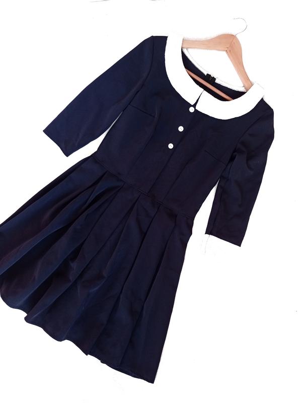 Приталене синє плаття з білим комірцем Одягалось пару раз Талія 72 см Довжина 90 си ПОГ у спокійному стані 42 см, тягнеться до 44 см, рукав-47 див. Воріт та обробка рукавів гіпюр. Ззаду на блискавці.
