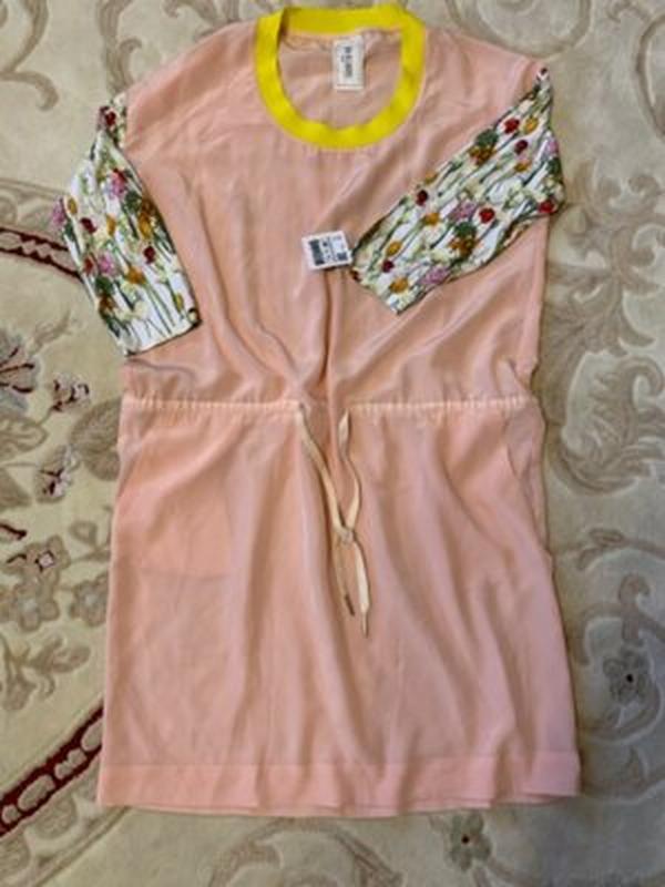 Плаття з шовку персикового кольору, нове, від ярлика лише тримач пластиковий лишився, ярлик зі складниками теж відсутній. Довжина- 91 см, плечі приспущені -54см, рукав від плеча- -36см, пог- 55см, до низу пряме, є бокові кишені, талія регулюється . Рукава з трикотажу віскозного .