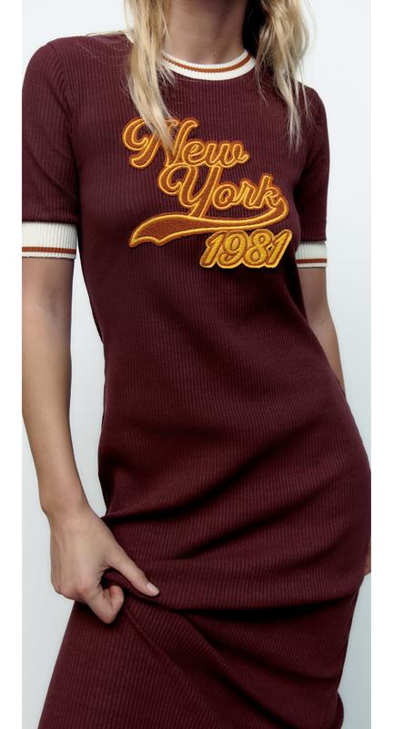 Платье миди с круглым вырезом и короткими рукавами. Ребристая кромка в сочетании с контрастной полосой.