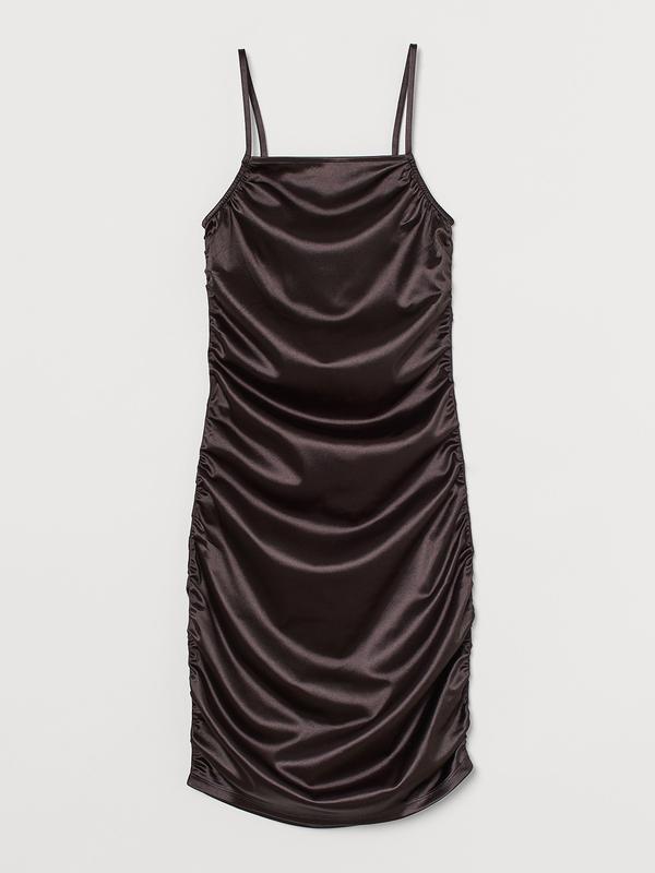 Платье темно-темно шоколадного цвета на бретелях ткань: атлас Дефектов нет; одевалась один раз С боковых сторон стяжки (дизайн платья) Прямой вырез Сидит по фигуре, не сковывает движения