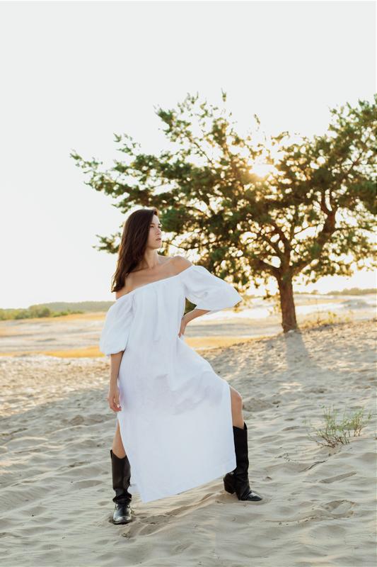 Сукня міді з широкими об'ємними рукавами Довжина 110 см Топ на резинці Рукава на резинці Довжина рукава: 45 см/18 дюймів Матеріал: 60% бавовна, 40% льон Текстура нерівномірна, в дрібній точці