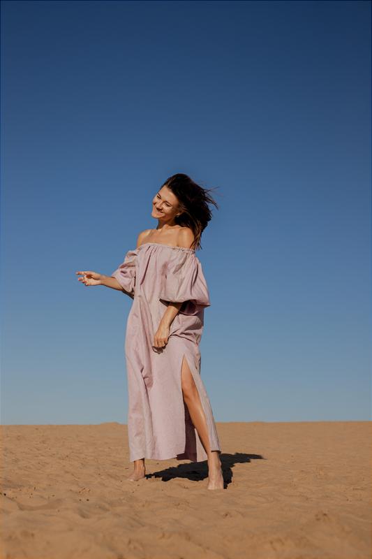 Сукня міді з широкими об'ємними рукавами Довжина 110 см Топ на резинці Рукава на резинці Довжина рукава: 45 см/18 дюймів Матеріал: 60% бавовна, 40% льон Текстура нерівномірна, в дрібній точці