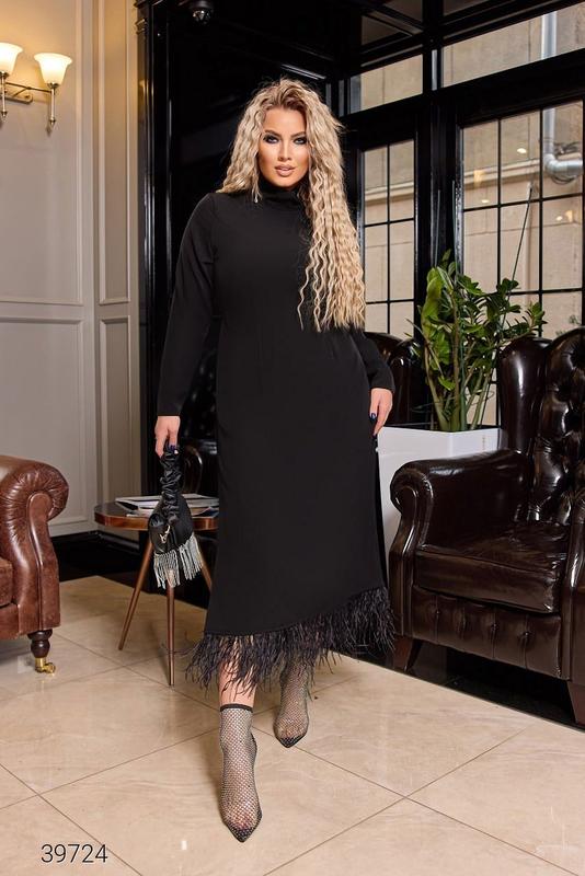 Черное платье миди. Отделка – перья марабу, сбоку разрез, застежка – молния. Сзади шнуруется – этим регулируется приталенность. Ткань: итальянская костюмная ткань (плотный, шелковистый материал, гладкая структура, скользящая на ощупь). Ориентировочные замеры по готовому изделию: 42-44 (ОГ 78-92, ОТ 58-78, ОБ до 96), 46-48 (ОГ 92-98, ОТ 60-80, ОБ до 106), 50-52 (ОГ 100-115, ОТ 70-90, ОБ до 115, ширина руки зверху 41), 54-56 (ОГ 110-126, ОТ 75-100, ОБ до 128, ширина руки зверху 45)