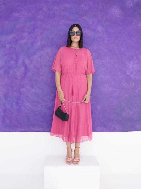 круглая горловина с завязкой короткие рукава эластичный пояс длина макси с левой стороны есть небольшие затяжки (см. 4 фото) от сумки. 100% полиэстер
