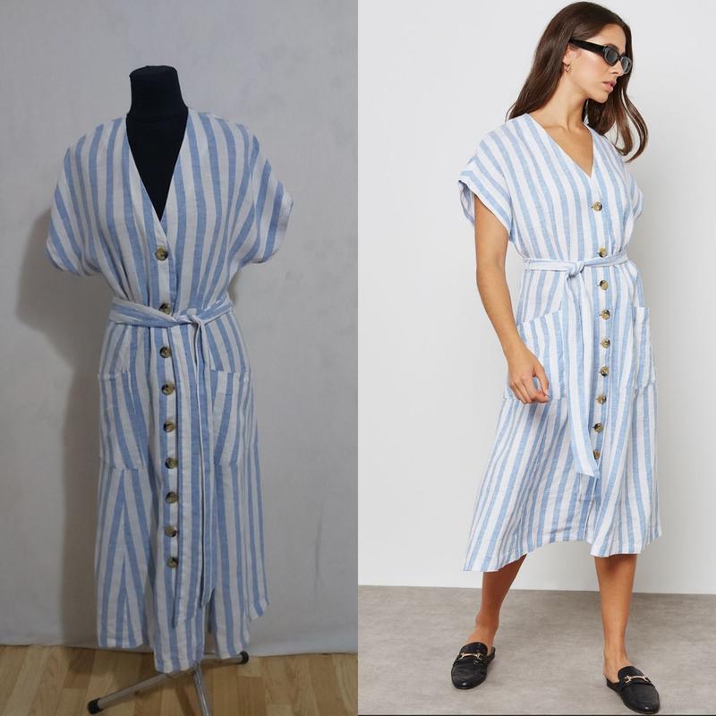 Льняное платье в бело-голубую полоску на пуговицах по длине 100%- лен mango casual