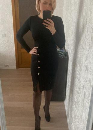 Черное платье, размера М. Ткань тянется, украшена пуговицами и не большим разрезом. Приятная к телу. ( рост модели 174). Обхват груди, см - 92-95 Обхват талии, см - 72-76 Обхват стегон, см - 94-98 Длина рукава, см - 60