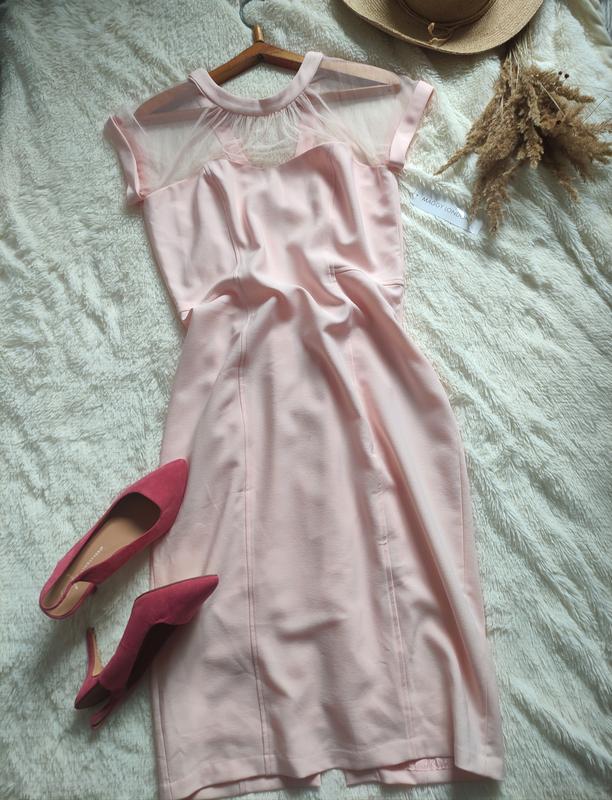 Красивое платье нежно розового цвета на замочке. Размер 50. Верхняя часть прозрачная сеточка, платье футляр по фигуре, на подкладке. Длина 111 см. ПОГ 47 см ПОТ 41 см ПОБ 53 см Тканина тягнеться.